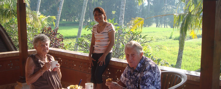 The room is large, bright and airy with a spacious tiled verandah overlooking the swaying palm trees alongside the rice paddies. There is an ensuite with a large bath tub, flush toilet, and the room also includes a refrigerator. Breakfast is included in the price of this budget accommodation, and if required, you can ask to buy your lunch and/or dinner from the family who operate the Guesthouse. It’s always tasty food!